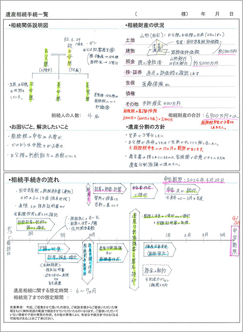 また、無料相談時にはA3のヒアリングシートをご用意し、今後必要となる手続き内容を整理してお伝えします。